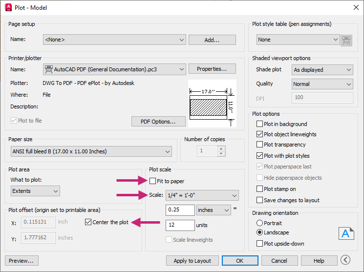 Under Plot Scale, clear Fit to Paper, and then click the Scale drop-down list and choose 1/4" = 1'-0".