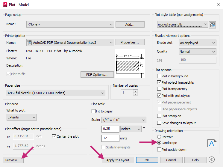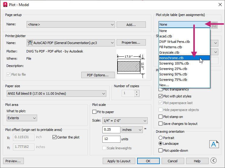 Under Plot Style Table (Pen Assignments), click the Plot Style Table drop-down list and choose monochrome.ctb.