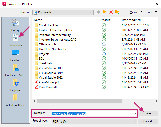 In the Browse to Plot File dialog box, browse to the Documents folder or a different location, and then provide a filename for the PDF file. Click Save.