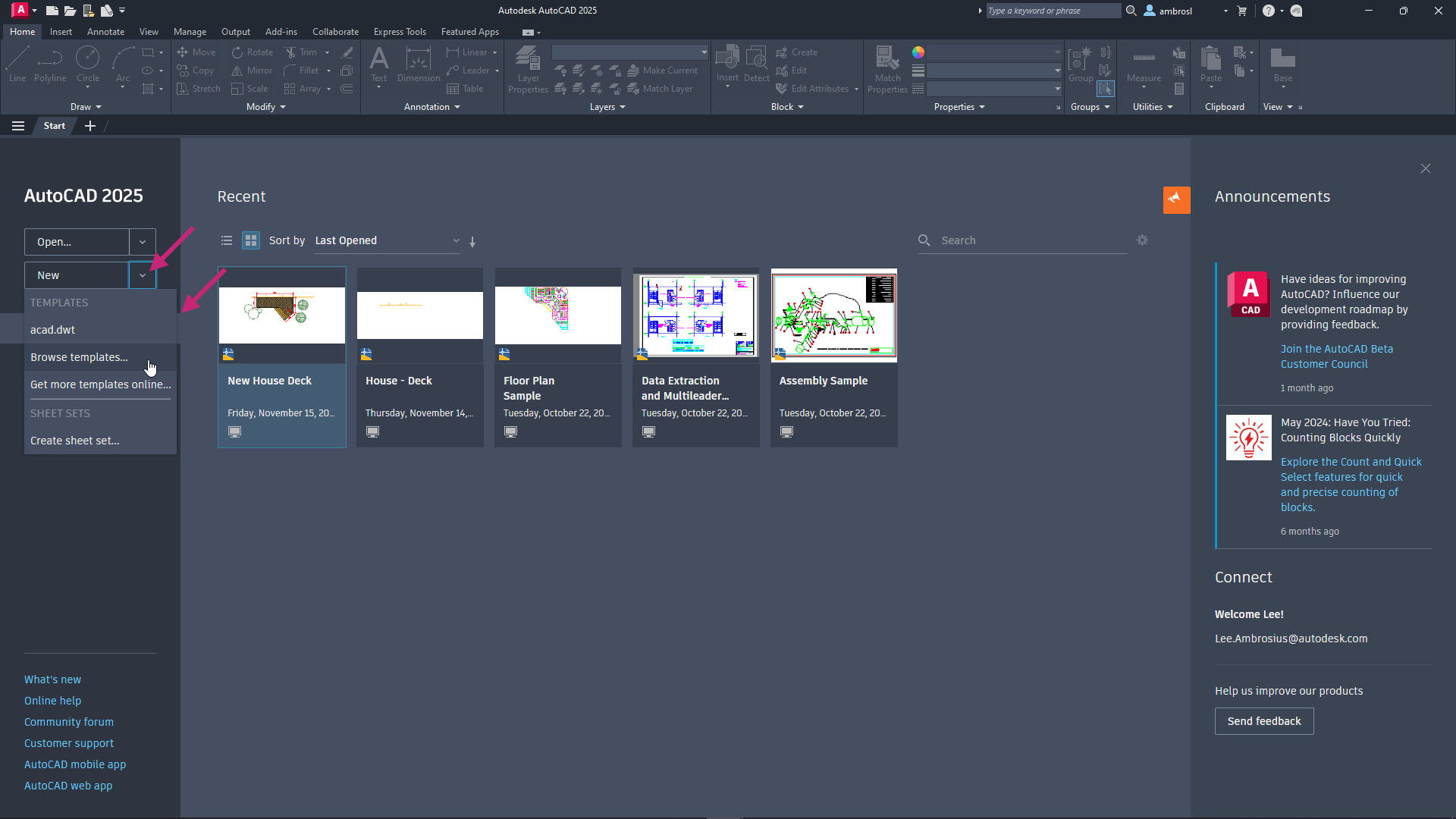 1. On the Start tab, click the New drop-down menu and choose Browse Templates.