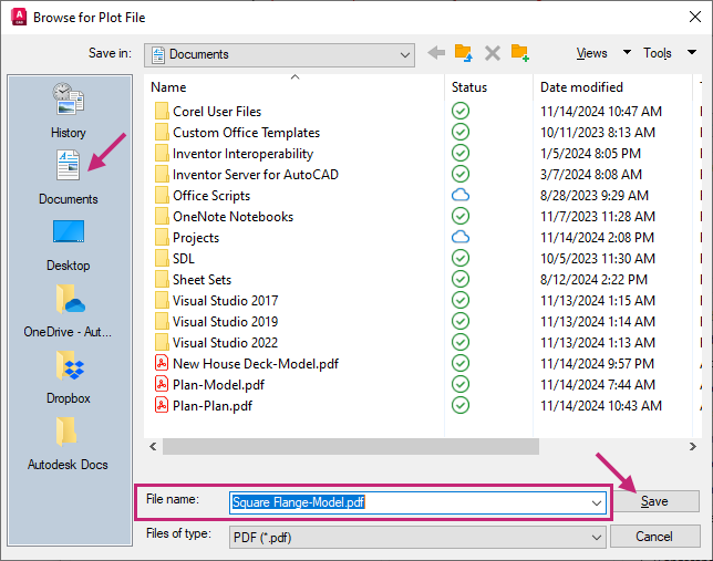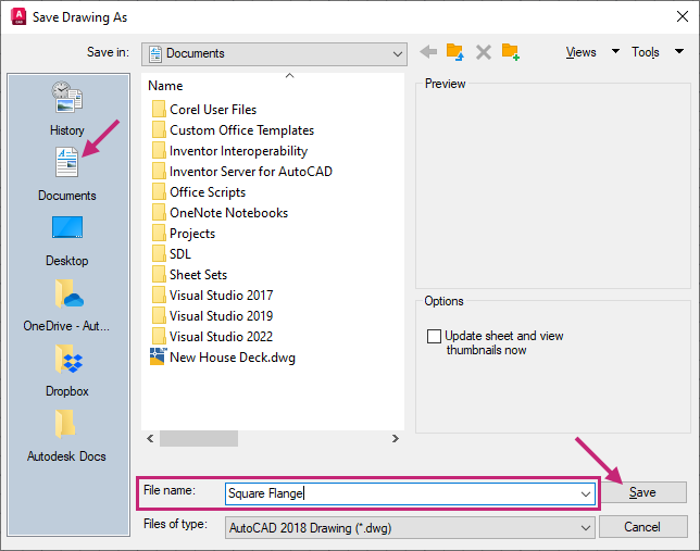 4. In the Save Drawing As dialog box, browse to the Documents folder.
