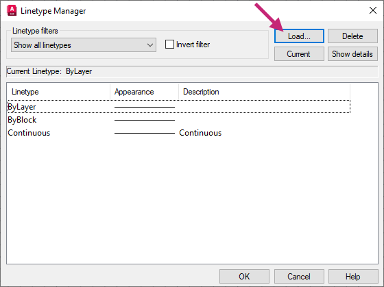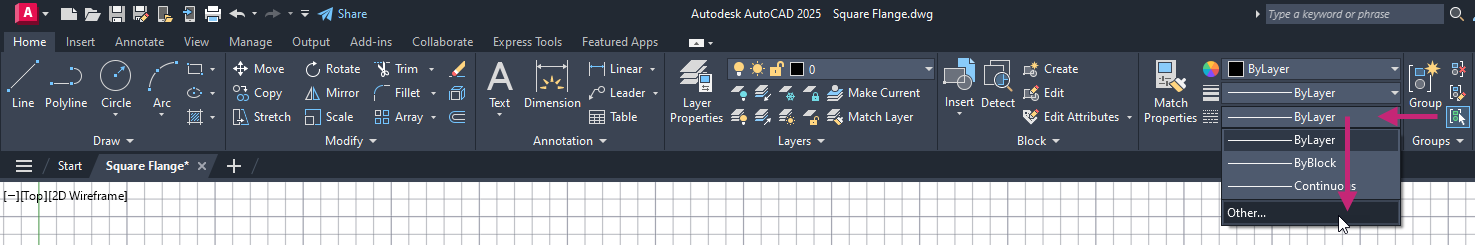 1. On the ribbon, click Home tab > Properties panel > Linetypes drop-down list > Other.