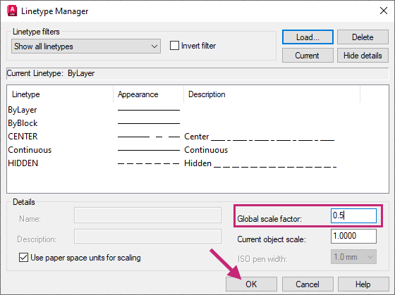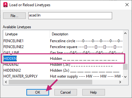 3. In the Load or Reload Linetypes dialog box, hold down the Ctrl key and select CENTER and HIDDEN in the list of linetypes. Click OK.