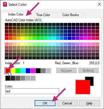 6. In the Select Color dialog box, Index Color tab, click the Red (1) color swatch and then click OK.