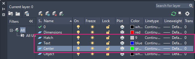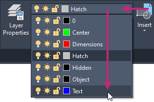 3. On the ribbon, click Home tab > Layers panel > Layers drop-down list and choose Center.