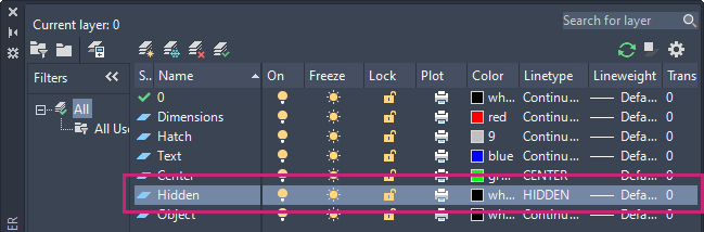 12. Create a sixth and final layer with the name Hidden and assign it the White (7) color and HIDDEN linetype.