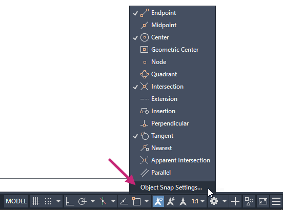 2. On the status bar, right-click over the Snap Cursor to 2D Reference Points button and choose Object Snap Settings.