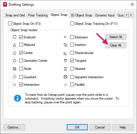 3. In the Drafting Settings dialog box, Object Snap tab, click Clear All.