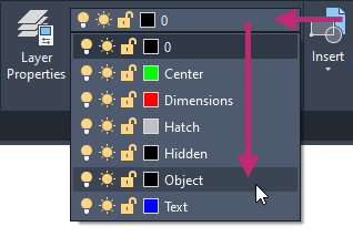 6. On the ribbon, click Home tab > Layers panel > Layers drop-down list and choose Object.
