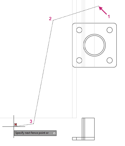 18. At the Specify second extension line origin or [Select/Undo] <Select>: prompt, specify the endpoint indicated at (3) in the following image.