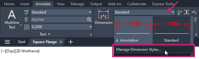 3. On the ribbon, click Annotate tab > Dimensions panel > Dimension Styles drop-down list and choose Manage Dimension Styles.