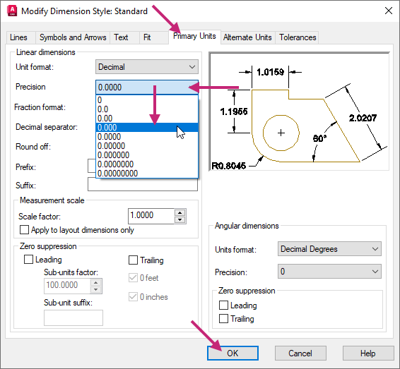 6. In the Modify Dimension Style: Standard dialog box, Primary Units tab, click the Precision drop-down list and choose 0.000.