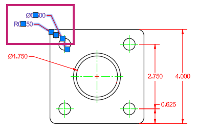 28. With no command active, select the radial and diametric dimensions that dimension the fillet and small circle.