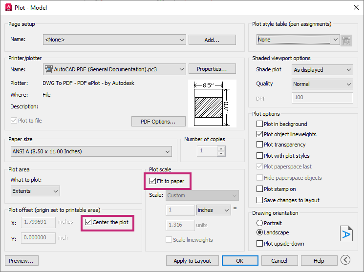 3. In the Plot - Model dialog box, under Printer/Plotter, click the Name drop-down list and choose AutoCAD PDF (General Documentation).pc3.