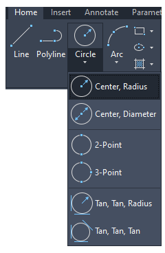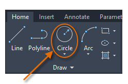 - On the ribbon, click Home tab > Draw panel > Circle drop-down menu > Center, Radius.Find