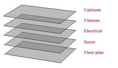 In the following design, the walls, exterior stone facing, doors, fixtures, cabinetry, HVAC, electrical, and text were assigned layers with different colors and linetypes to help differentiate between them. When a drawing becomes visually complex, you can hide the objects that you currently do not need to see with the use of layers. In the illustration below, on the right, the objects that represent doors and electrical wiring were temporarily hidden by turning off their assigned layers.