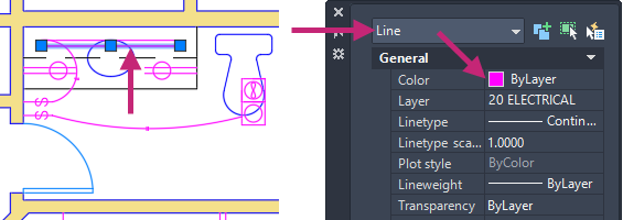 Notice that the current properties for the selected object are displayed in the Properties palette. You can change any of these properties by clicking it and changing the value. A property that is set to "ByLayer" inherits its value from its assigned layer. In the previous example, the line object's color of purple is inherited from its assigned layer of 20 ELECTRICAL.