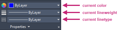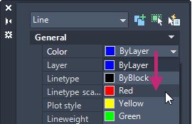 When the Properties palette is displayed and no objects are selected, the current property values are of those to be assigned to newly created objects. Property values listed as ByLayer, indicate properties that inherit their values from the layer to which the object is assigned. For example, changing the Color property value from ByLayer to Red causes all subsequent objects to be assigned the Red color which overrides the value of the assigned layer.