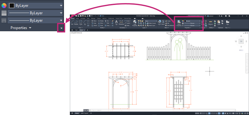 The Properties palette takes up a lot of space. For quick access to the most common properties, you can use the Properties panel on the ribbon. As you can see in this example, the listed properties will all be determined by the current layer.