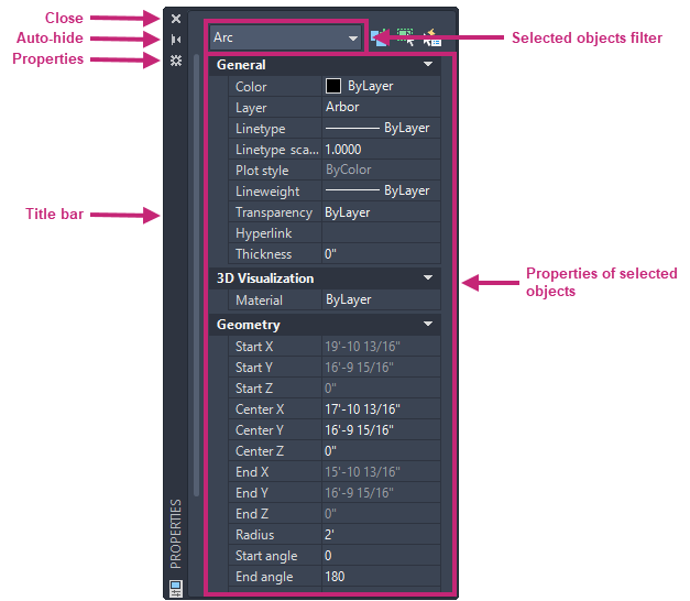 Note:The current values of several properties for the selected object are also displayed on the Properties panel of the ribbon.