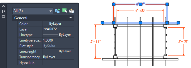 Notice that only the properties that are common to all selected objects are listed. The Layer property value likely shows as *VARIES*. This is because the selected objects are on more than one layer.