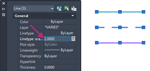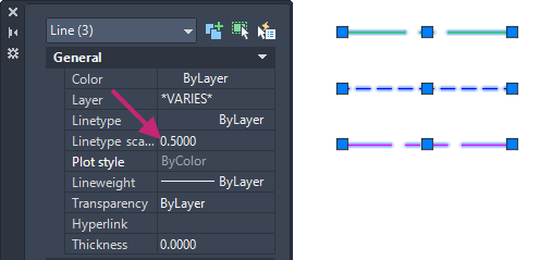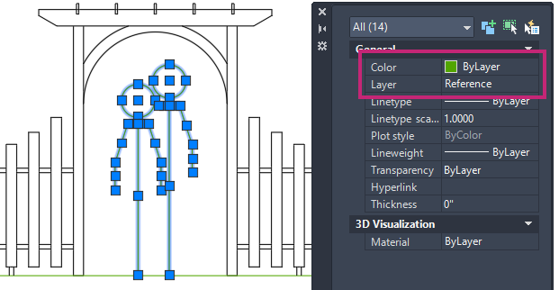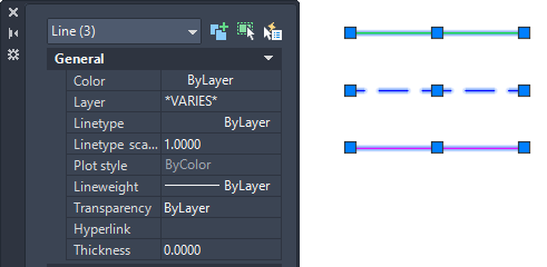 Most graphical objects of a drawing share several general properties which control their appearance. These general properties include color, linetype, linetype scale, lineweight, transparency, and plot style among others. Properties such as color and linetype can be changed per individual object, or across many objects with the use of layers.