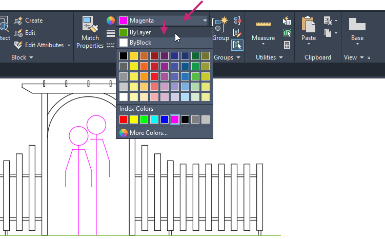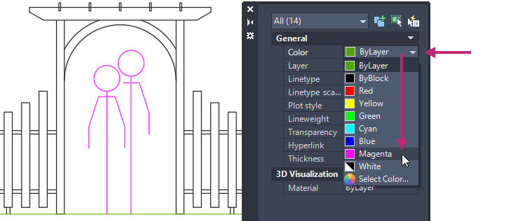 On the Properties palette, click the Color property and choose Magenta from the drop-down list.
