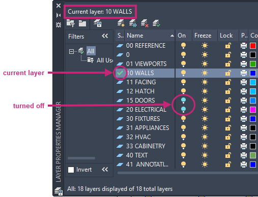 As you can see in the illustration, layer 10 WALLS is the current layer. All new objects are automatically assigned this layer. In the list of layers, the green check next to layer 10 WALLS confirms that it is the current layer.
