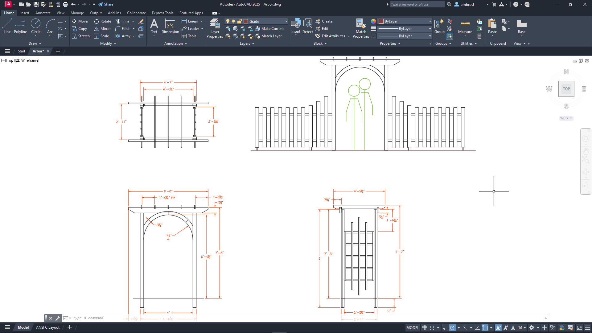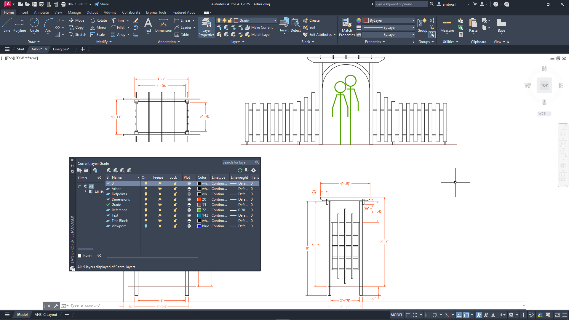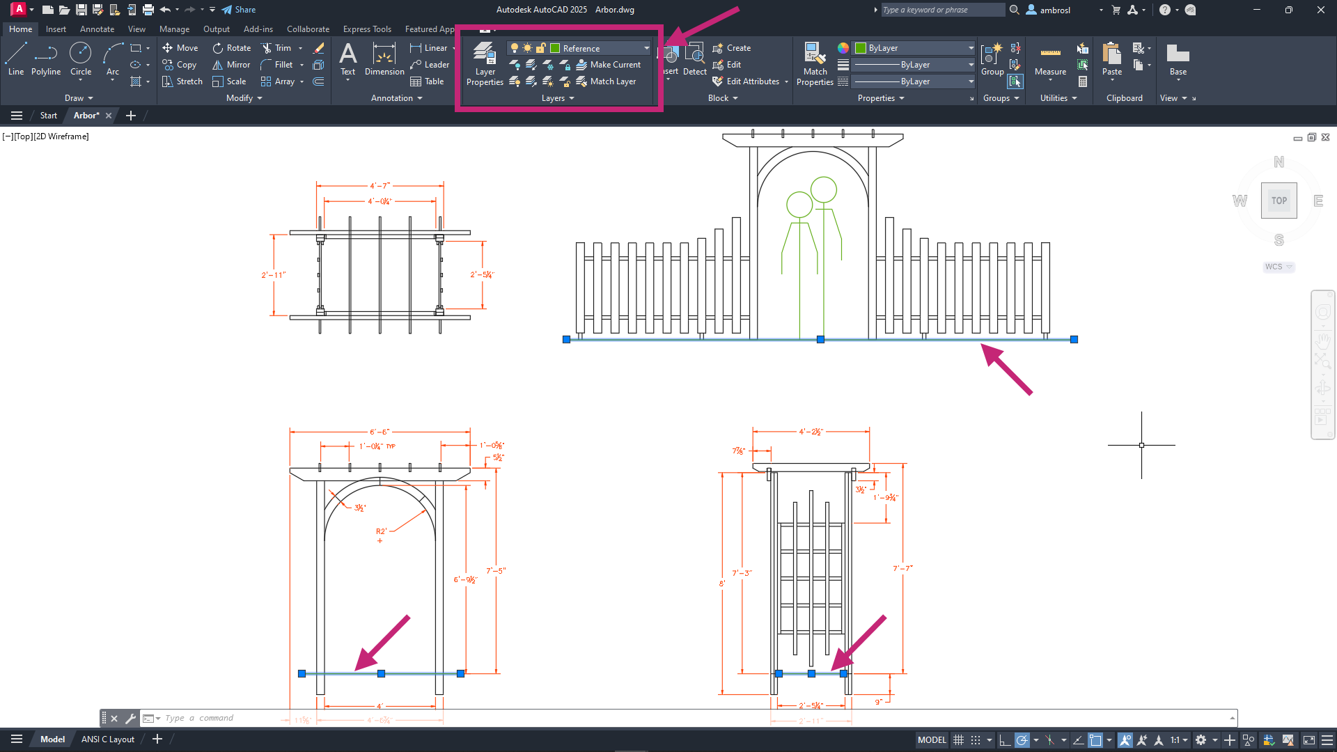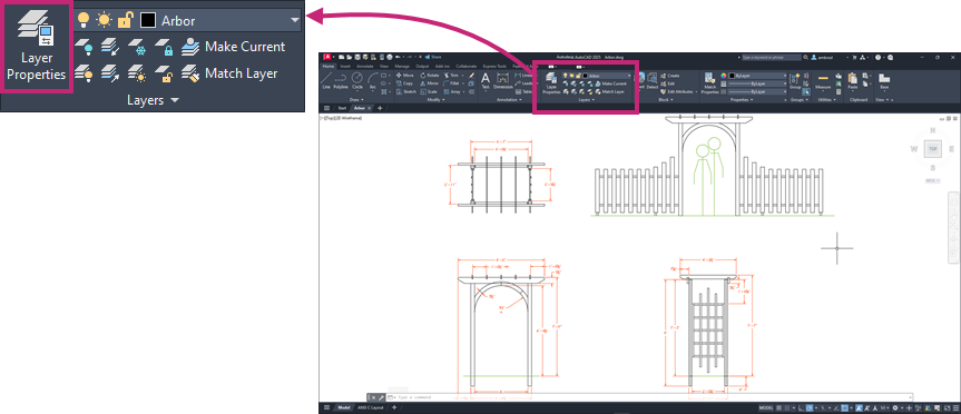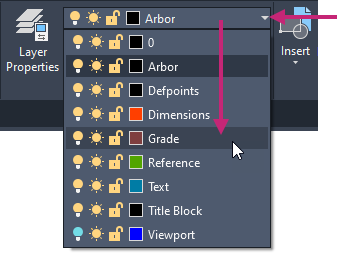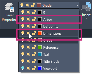 From the Layers drop-down list, unlock the Arbor layer and thaw the Dimensions layer by clicking the Locked Padlock and Snowflake icons.