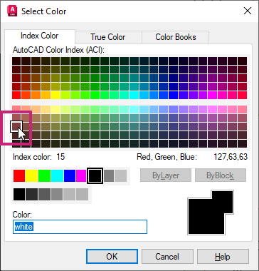 In the Color dialog box, Index Color tab, select the ACI 15 color swatch or type 15 in the Color text box. Click OK.