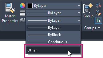 - On the ribbon, click Home tab > Properties panel > Linetypes drop-down list > Other.Find