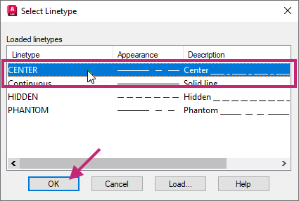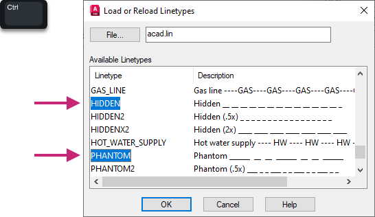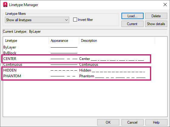 In the Load or Reload Linetypes dialog box, hold down the Ctrl key and select CENTER, HIDDEN, and PHANTOM from the Available Linetypes list. Click OK.