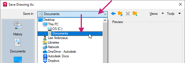 In the Save Drawing As dialog box, browse to the Documents folder.