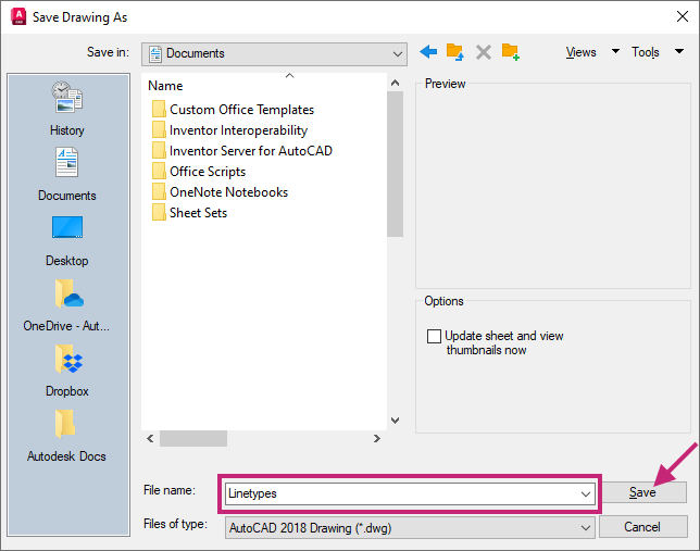 In the File Name text box, select the current name and type Linetypes. Click Save.
