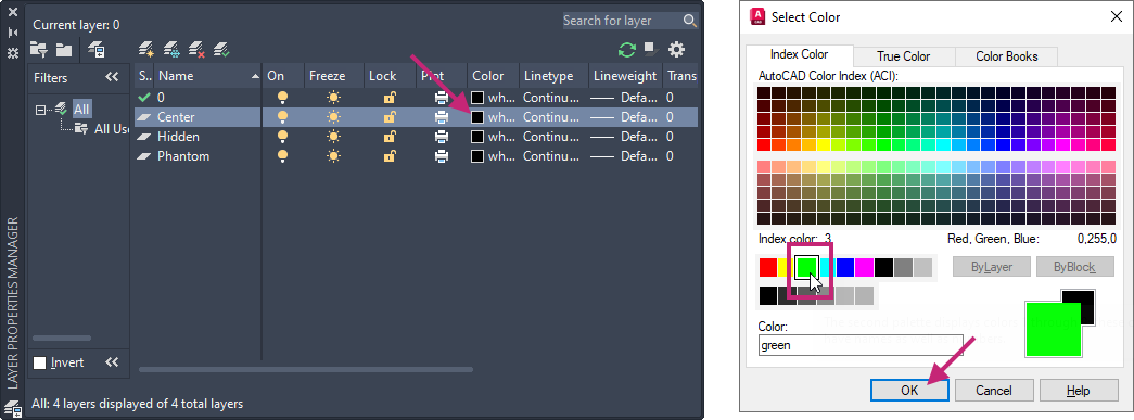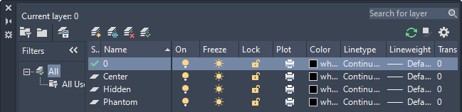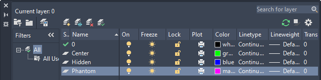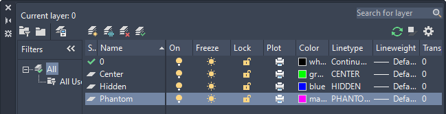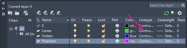 The Center, Hidden and Phantom linetypes are now available to be assigned to individual objects and layers.