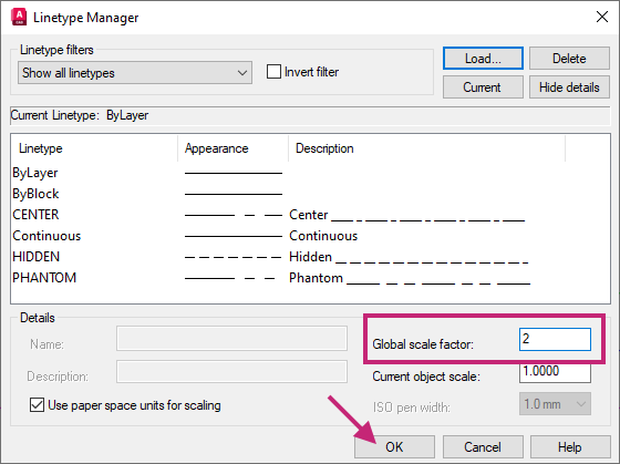In the Linetype Manager dialog box, under Details and in the Global Scale Factor text box, change the value to 2.