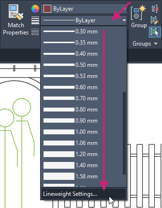 - On the ribbon, click Home tab > Properties panel > Lineweights drop-down list > Lineweight Settings.Find