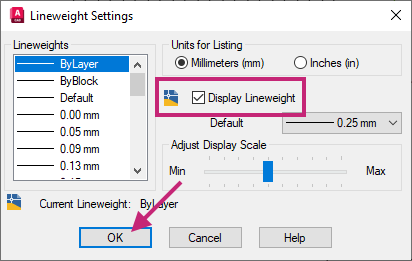 In the Lineweight Settings dialog box, check the Display Lineweight option and then click OK.