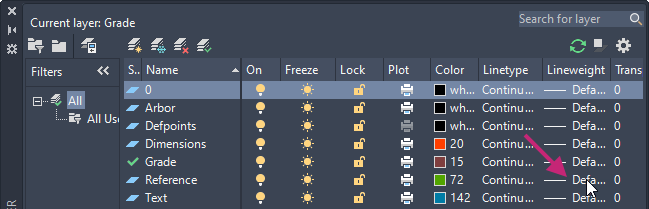 Note:If the Lineweight column is hard to see, move the cursor to the edge of the Layer Properties Manager opposite the title bar and drag to resize the palette.