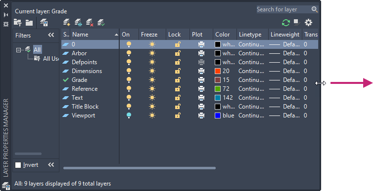 If the Linetype column is hard to see, move the cursor to the edge of the Layer Properties Manager opposite the title bar and drag to resize the palette.