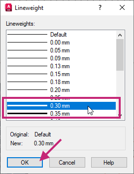 In the Lineweight dialog box, select 0.30 mm and then click OK.