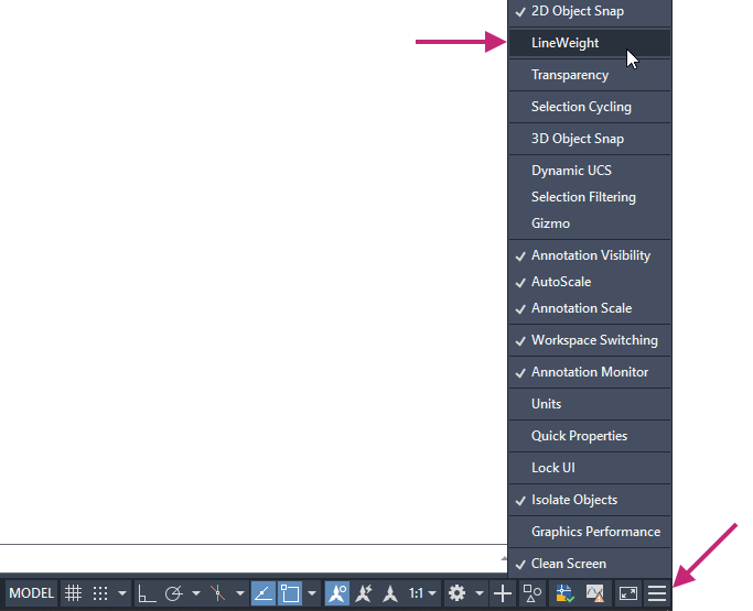 Remember:The Show/Hide Lineweight setting can also be found in the Lineweight Settings dialog box.