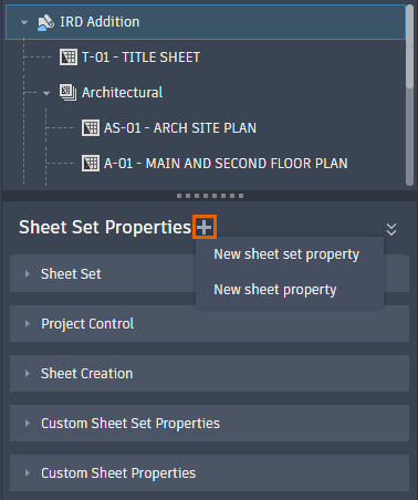 2. At the bottom of the Sheet Set Manager for Web, at the right of the Sheet Set Properties pane, click to create a new sheet set or sheet property.