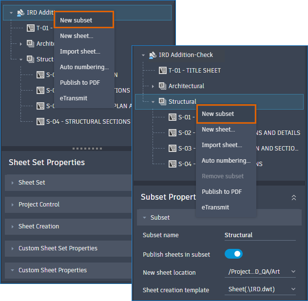 1. In the Sheet Set Manager for Web, right-click the sheet set node (at the top of the list), or an existing subset node. Choose New subset.