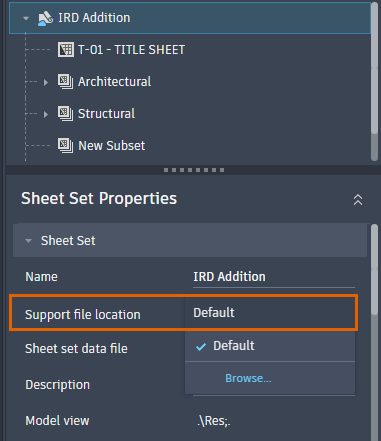 2. At the bottom of the Sheet Set Manager for Web, Sheet Set Properties pane, expand Sheet Set and click Support File Location drop-down.