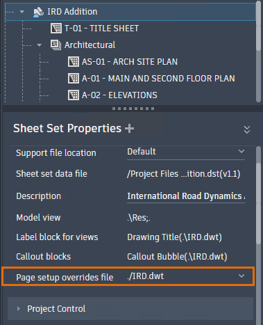 2. At the bottom of the Sheet Set Manager for Web, Sheet Set Properties pane, expand Sheet Set and click Page Setup Overrides File drop-down list.