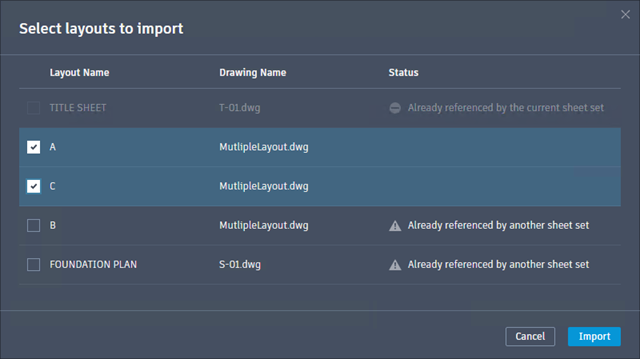 5. Select the layouts to be imported as sheets in the current sheet set or subset.