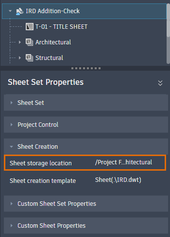 2. At the bottom of the Sheet Set Manager for Web, Sheet Set Properties pane, expand Sheet Creation and click Sheet Storage Location drop-down.