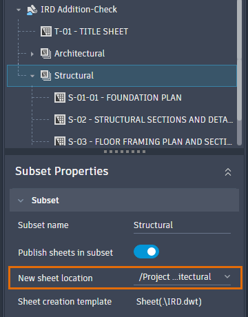 If you've selected a subset, under Subset Properties pane, expand Subset and click New Sheet Location drop-down.