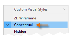 - From the viewport controls, click [2D Wireframe] and choose Conceptual from the menu.